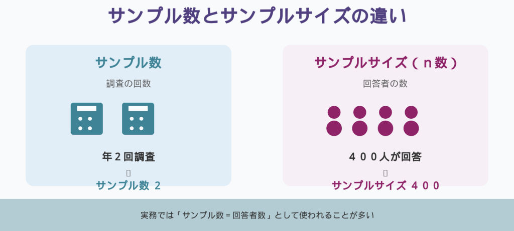 実務の現場では「サンプル数」と言ったときに「回答者数(サンプルサイズ)」を指していることが多く、厳密な統計用語としての使い分けがされていないケースもあります。本記事では、一般的な用法に合わせて「必要な回答者数」という意味でサンプル数を解説していきます。