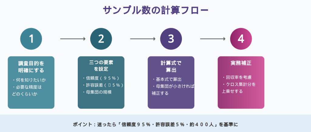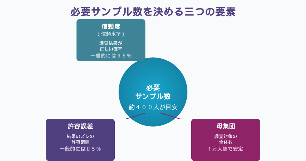 適切なサンプル数を決定するためには、「信頼度」「許容誤差」「母集団」という三つの要素を理解する必要があります。