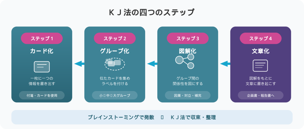 KJ法は「カード化→グループ化→図解化→文章化」の4つのステップで進めます。ブレインストーミングと組み合わせて使うのが一般的で、まずブレインストーミングでアイデアを発散させた後、KJ法で整理・収束させるという流れになります。