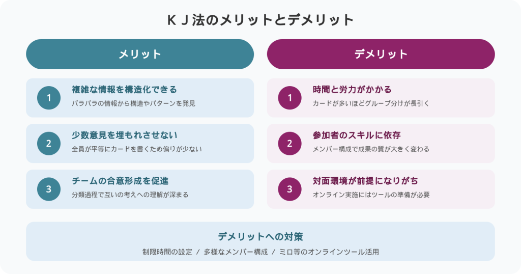 KJ法には多くのメリットがある一方で、実施にあたって把握しておくべきデメリットや注意点もあります。