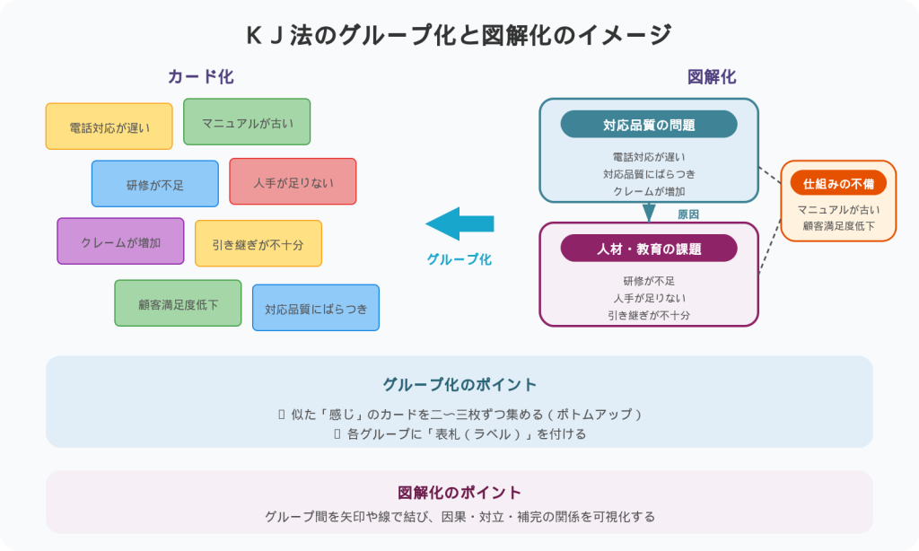KJ法は、断片的な情報やアイデアを整理し、全体の構造を見える化するための実践的なフレームワークです。「カード化→グループ化→図解化→文章化」の四つのステップを順に進めることで、複雑な課題の本質を捉え、チームでの合意形成を促進できます。