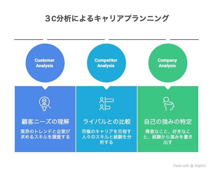 | Competitor(ライバル=他の人) | 同じようなキャリアを目指す人は、どんなスキルや経験を持っているか? | 転職サイトで同じ職種や年代の人のプロフィール(公開されている範囲で)を見てみたり、SNSで活躍している人の情報をチェックしてみましょう。 |