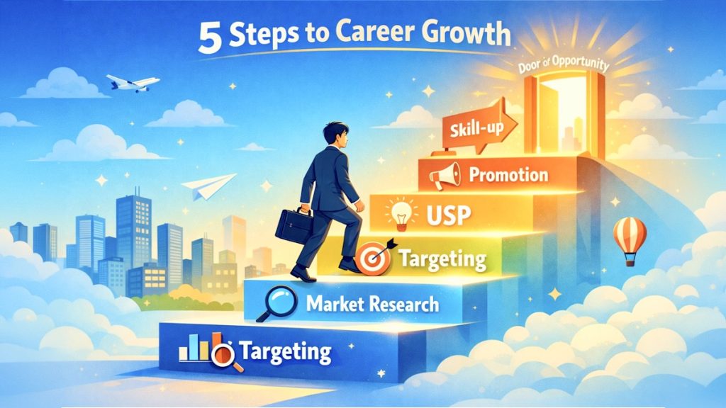 では、具体的にどうすれば「私」という商品を魅力的にデザインできるのでしょうか?実は、ビジネスの世界で使われているマーケティングの考え方が、あなたのキャリアデザインにもとても役立ちます。難しく考えず、一緒に5つのステップを見ていきましょう。